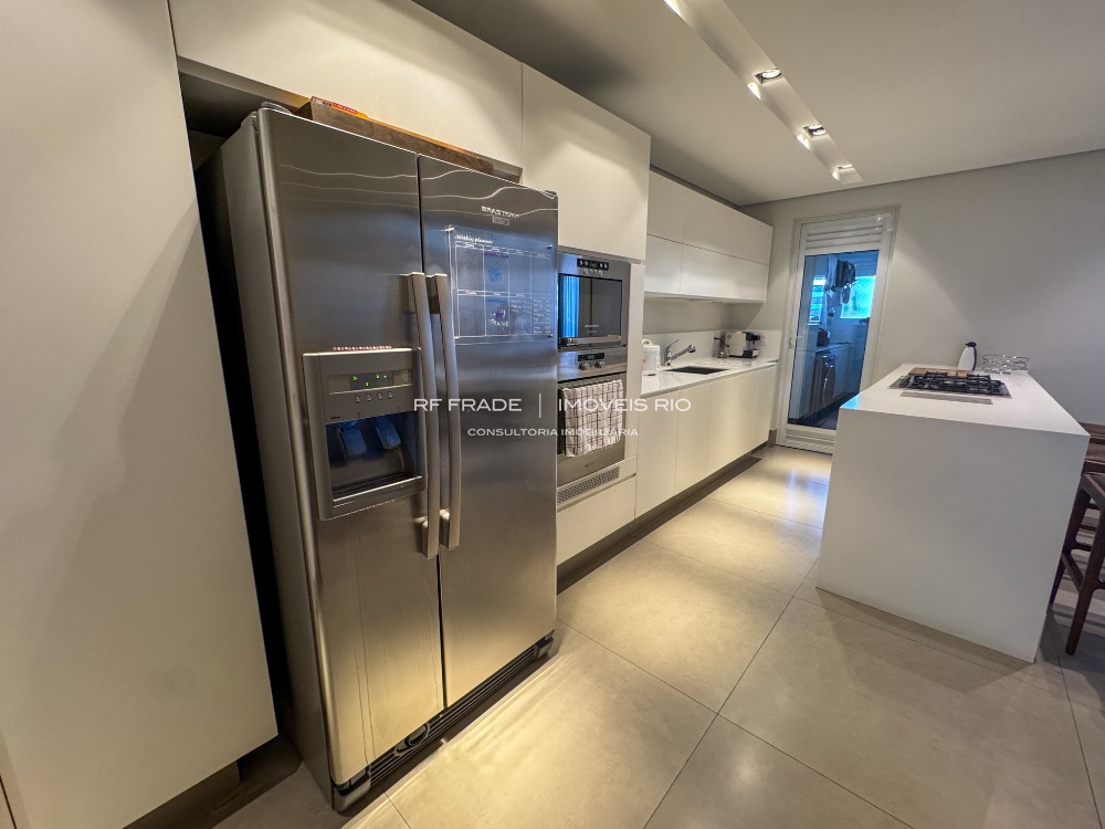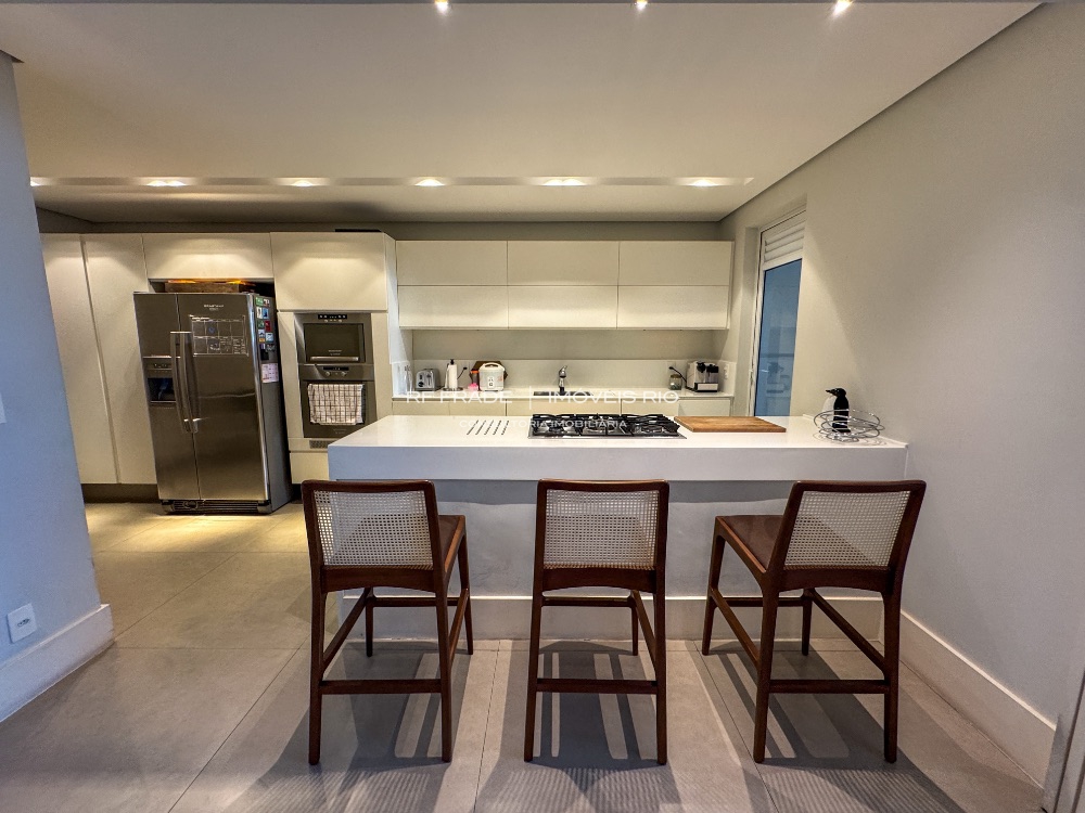 A cozinha, com integração à sala e à varanda, cria uma atmosfera leve, fluida e banhada por luz natural.