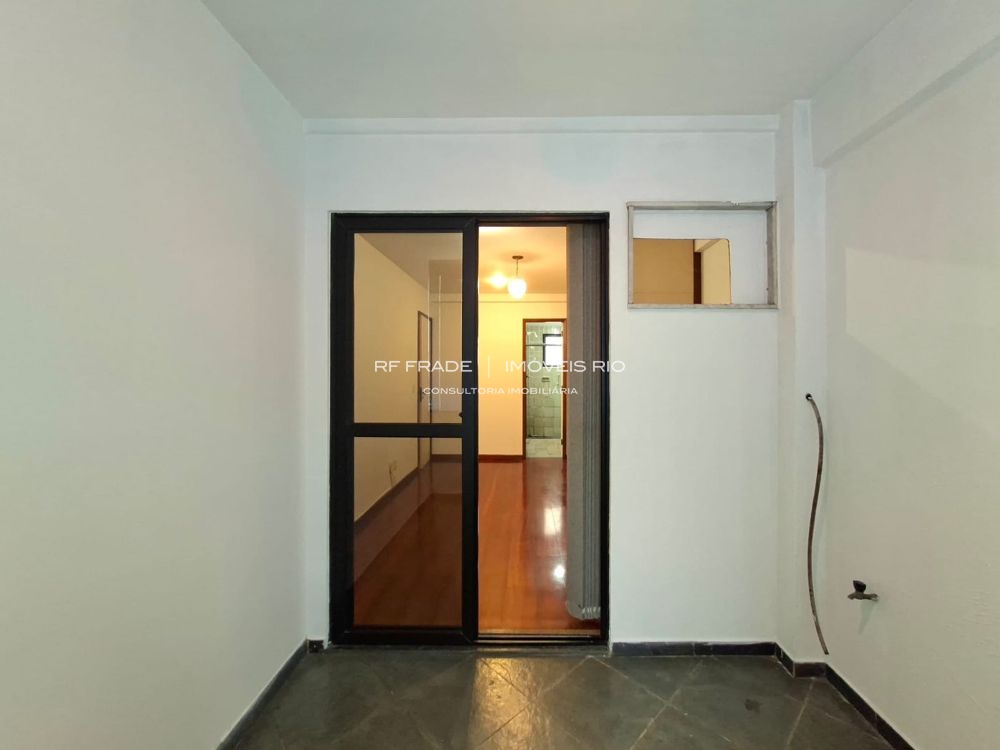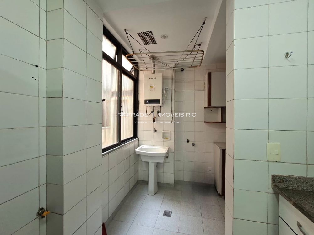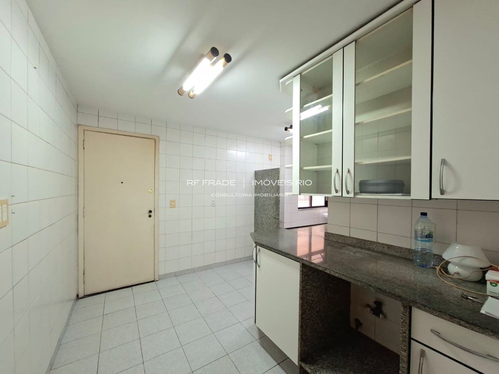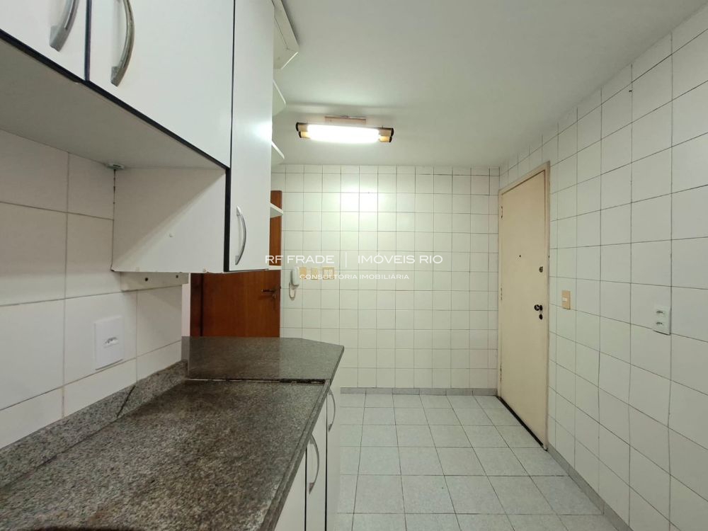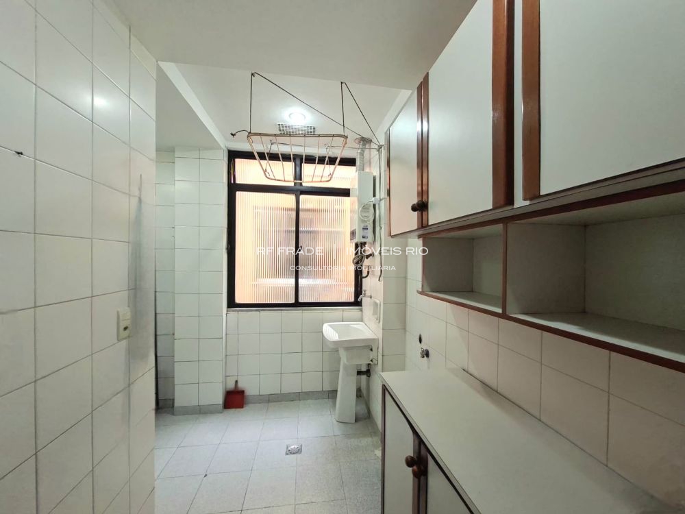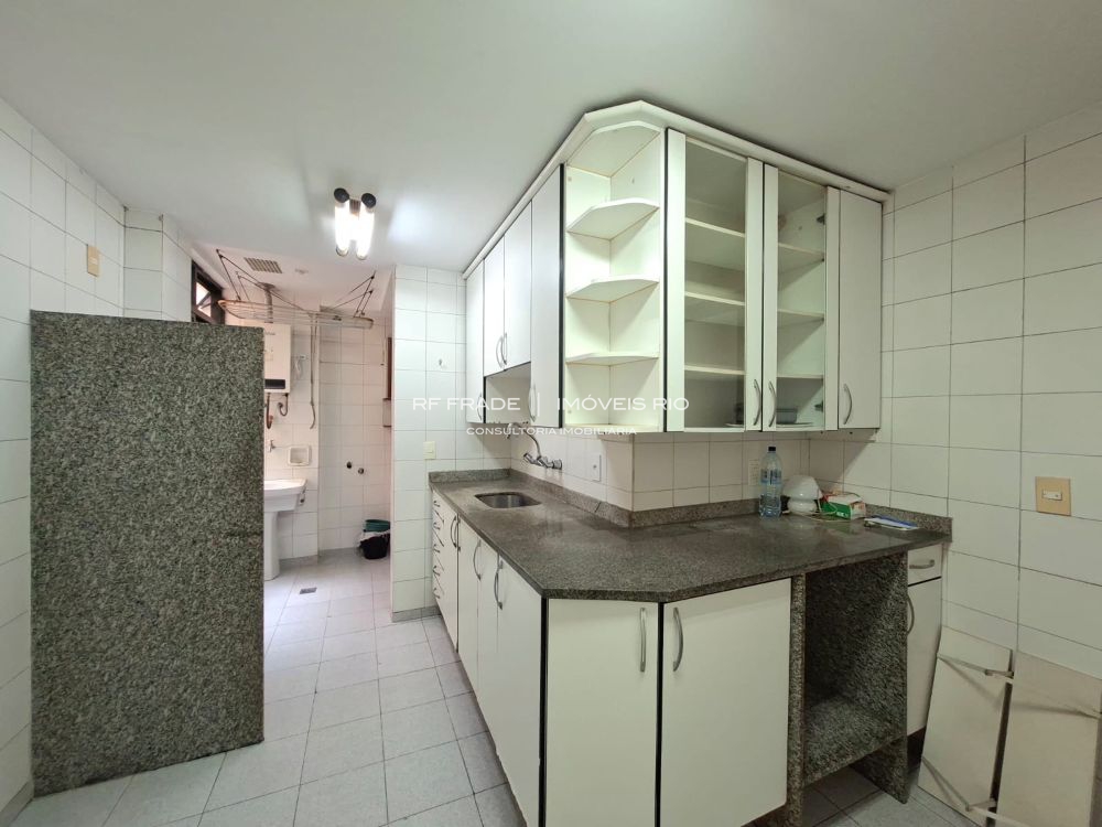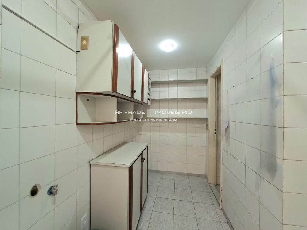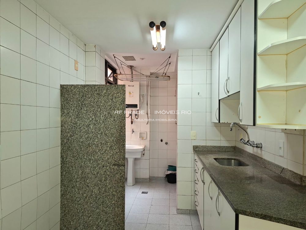 Cozinha, ampla área de serviço e banheiro de serviço. Parte da área de serviço pode ser convertida em dependência completa.