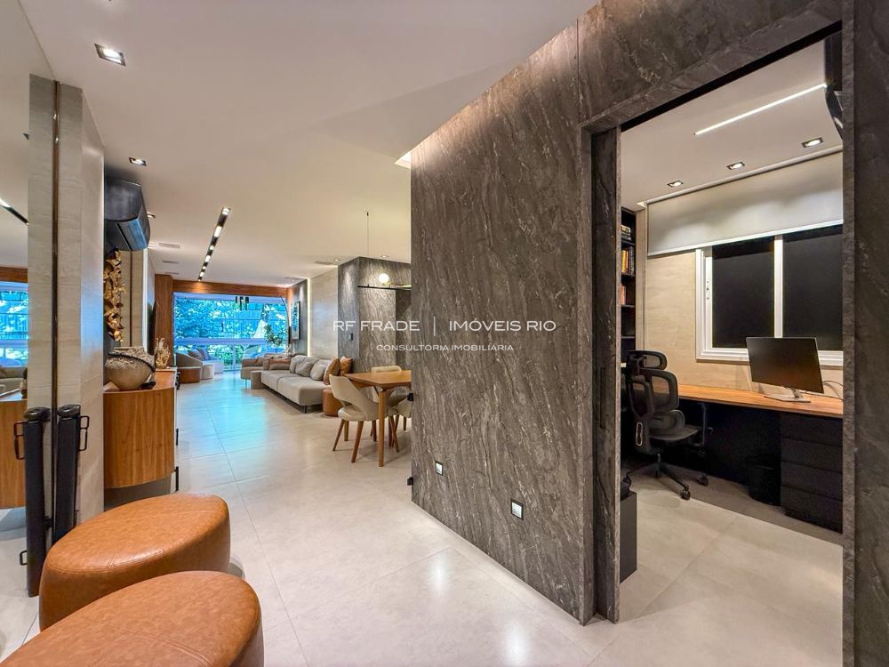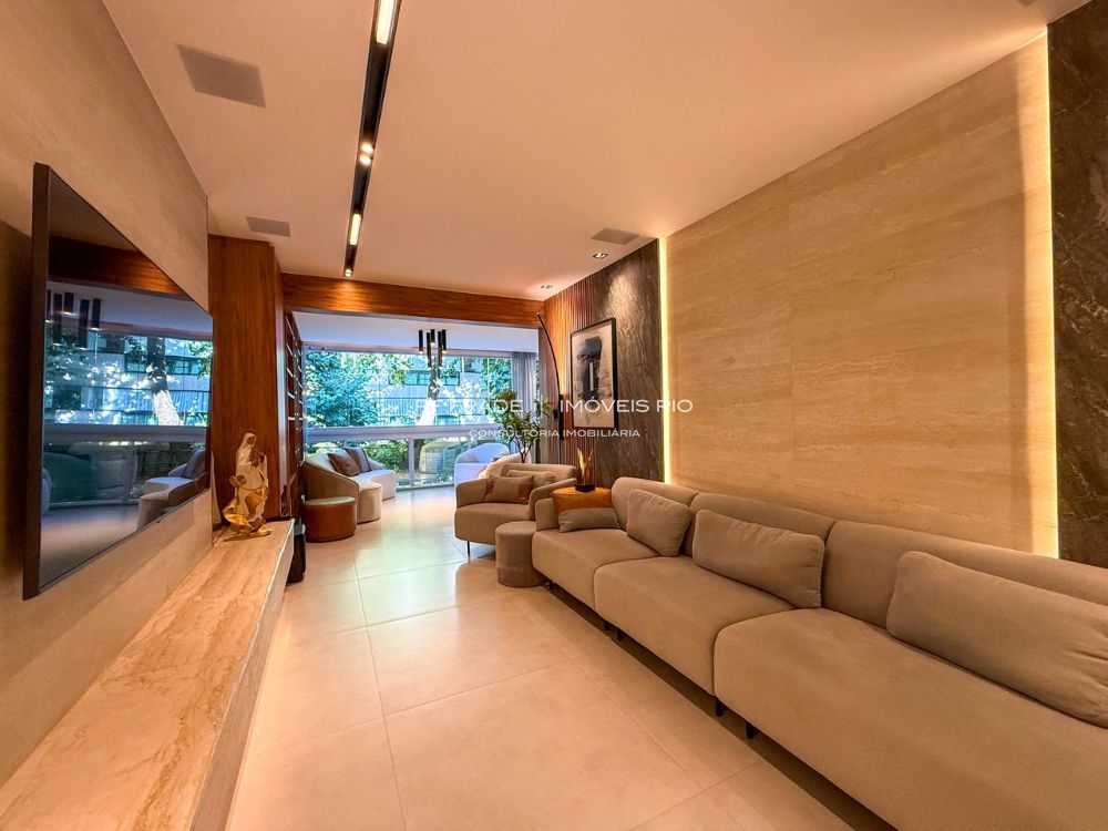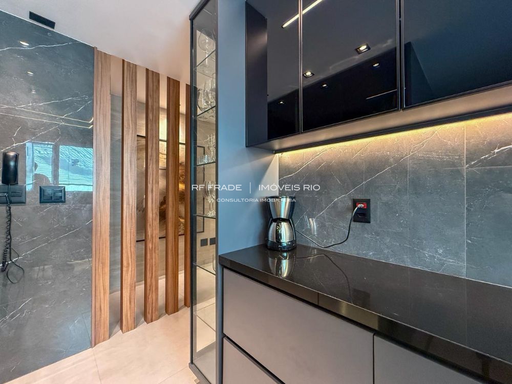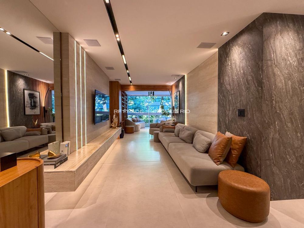 O apartamento foi totalmente reformado do zero. Acabamentos de alto padrão, com destaque para o uso de travertino romano. O projeto é assinado por designer, incluindo móveis e peças exclusivas. O apartamento tem um padrão de acabamento diferenciado: não há paredes pintadas — tudo é revestido com marcenaria, espelhos, pedras ou texturas.