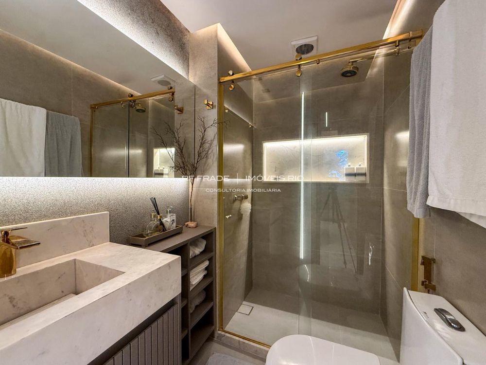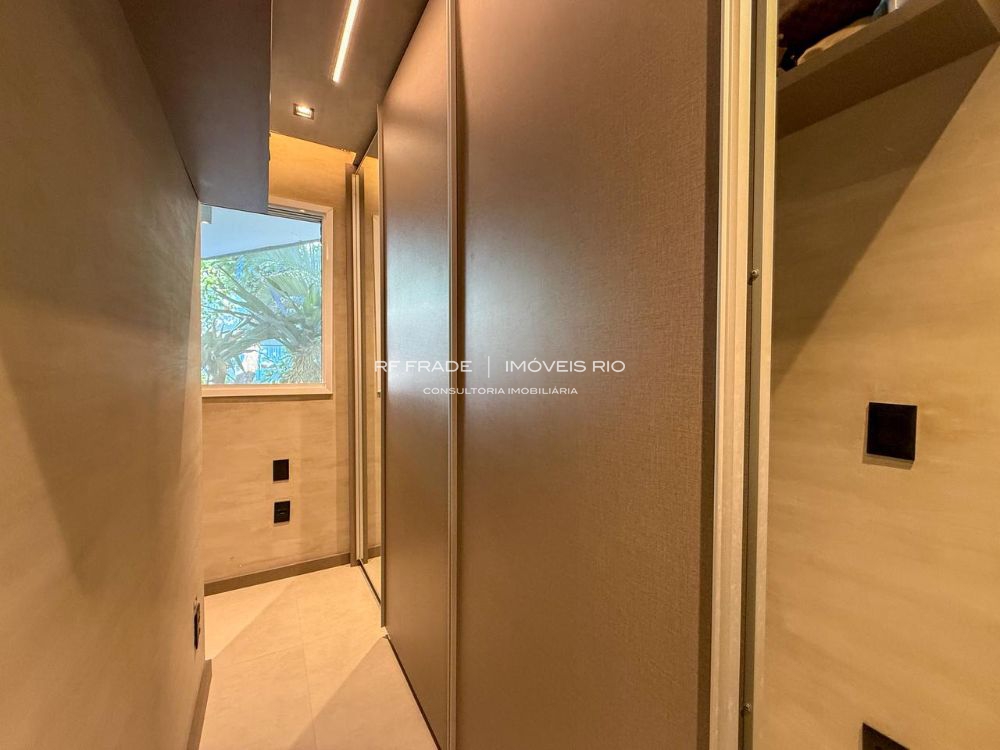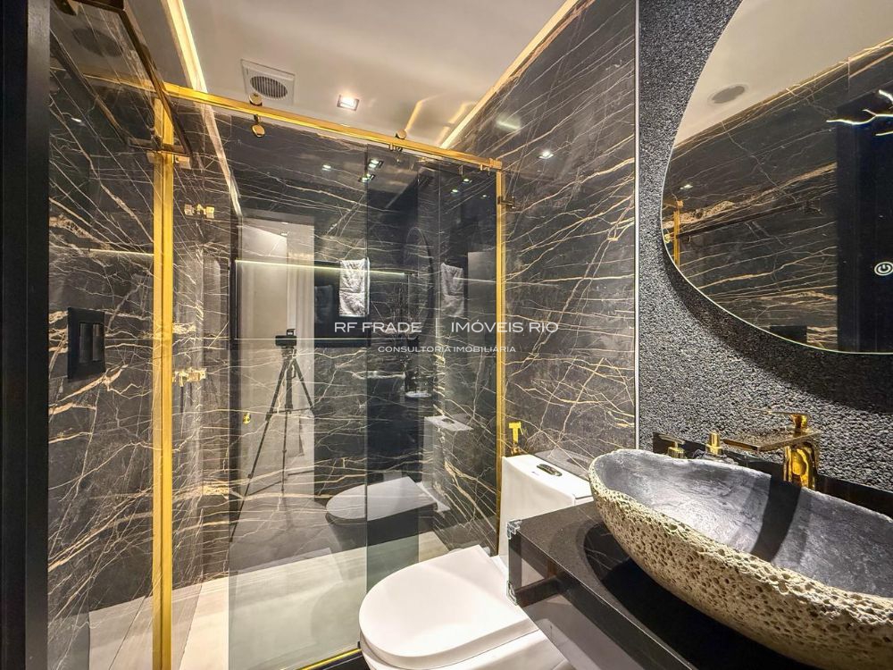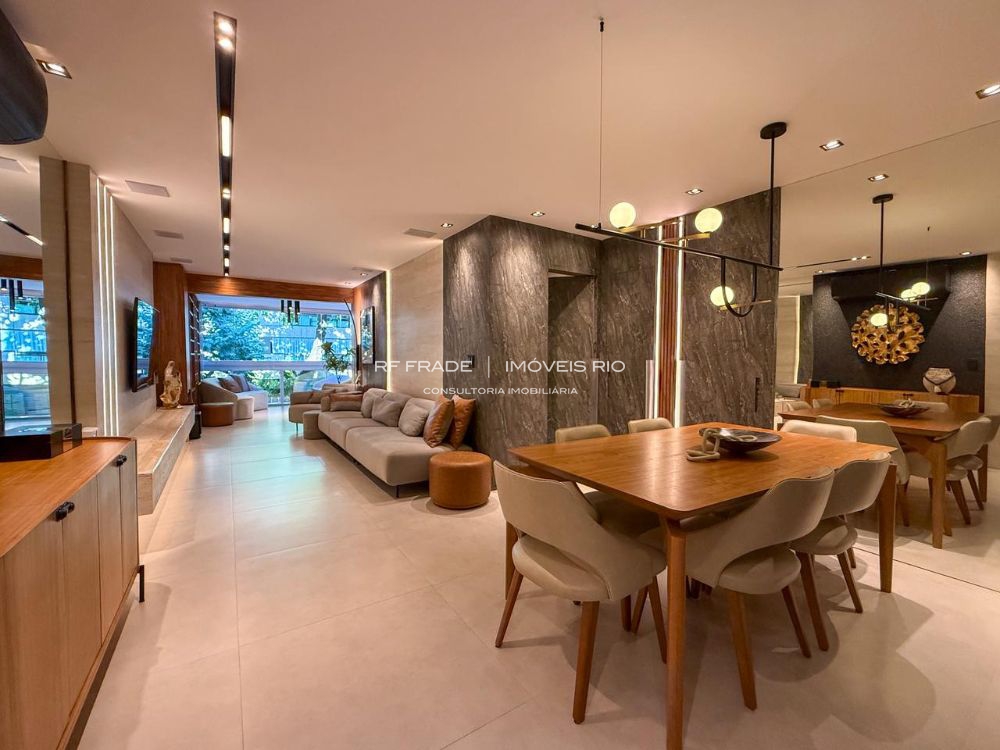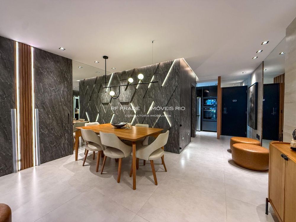 O apartamento foi totalmente reformado do zero. Acabamentos de alto padrão, com destaque para o uso de travertino romano. O projeto é assinado por designer, incluindo móveis e peças exclusivas. O apartamento tem um padrão de acabamento diferenciado: não há paredes pintadas — tudo é revestido com marcenaria, espelhos, pedras ou texturas.