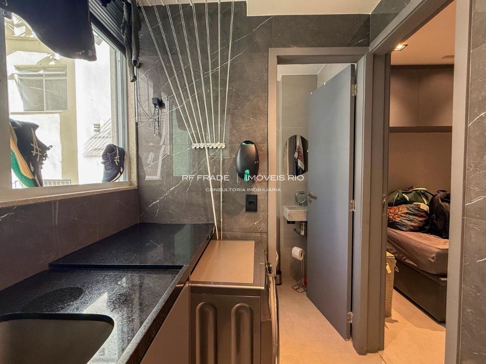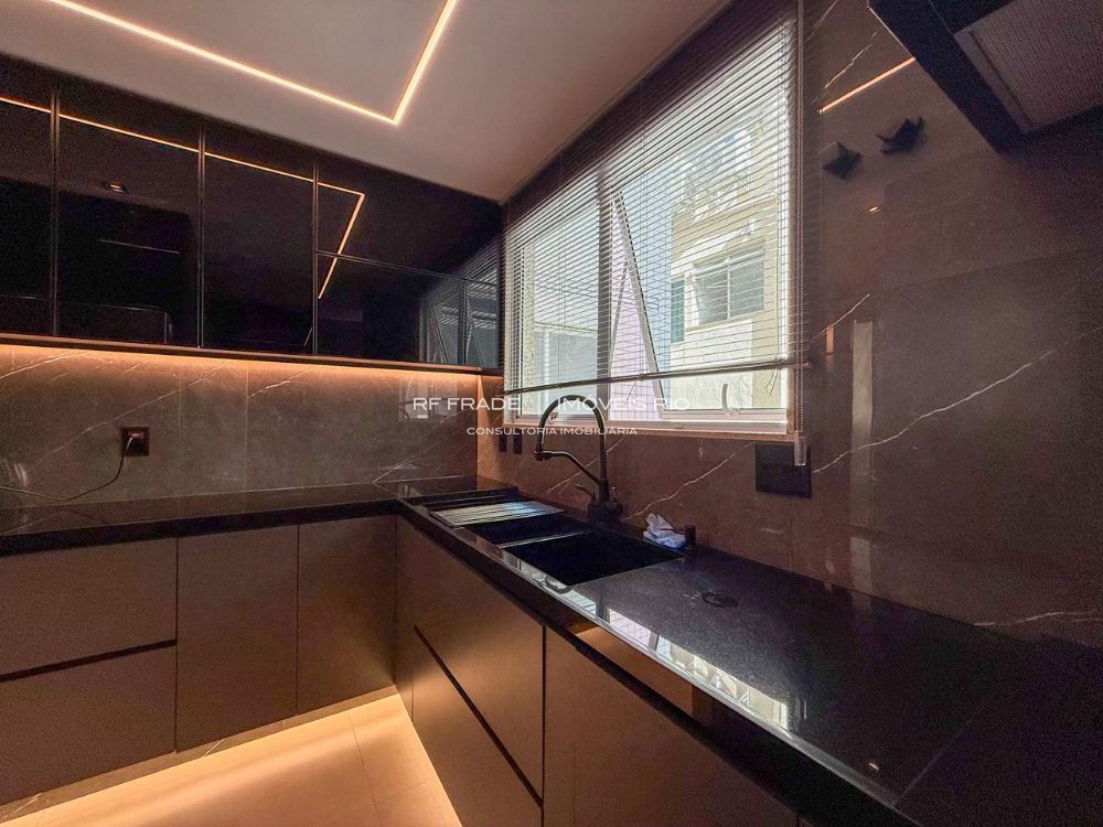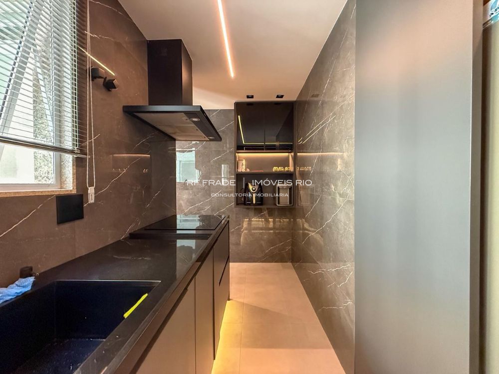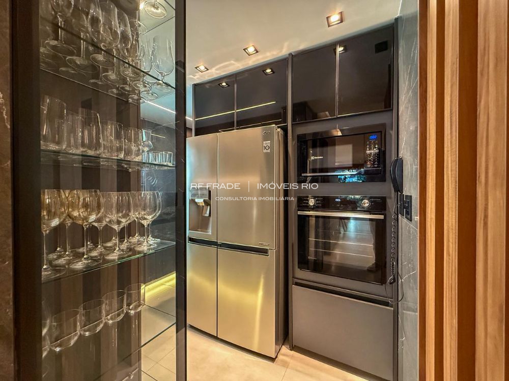 A cozinha tem armários sofisticados, com gavetas ocultas e divisórias internas sob medida, área de serviço e dependência completa de funcionária doméstica. A dependência pode ser facilmente transformada em suíte, pois já há preparação em drywall. O proprietário também possui materiais sobressalentes para eventuais adaptações.