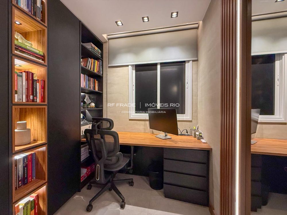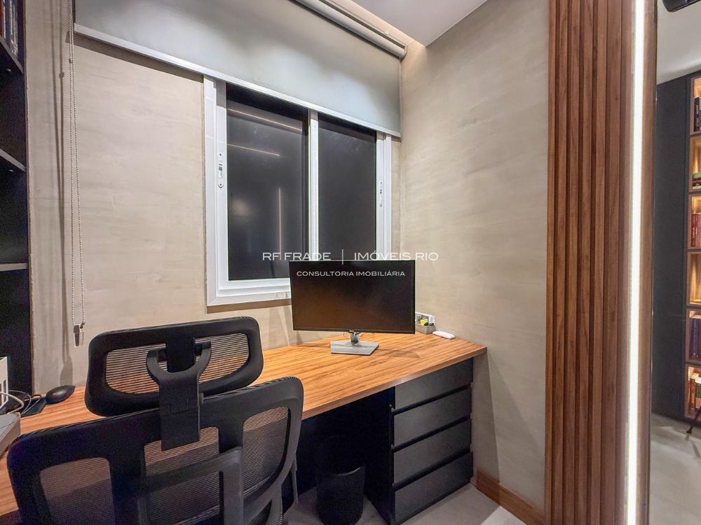 A parte íntima conta com três quartos sendo uma suíte com closet. Um antigo quarto virou escritório planejado, que pode ser facilmente ampliado para voltar a ser um quarto de solteiro. Há também um belíssimo banheiro social conectado ao segundo quarto (o transformando em uma suíte, se quiser).