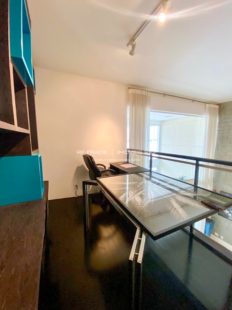 O mezanino acrescenta sofisticação e amplitude, ideal para um espaço de trabalho ou momentos de leitura e contemplação.
