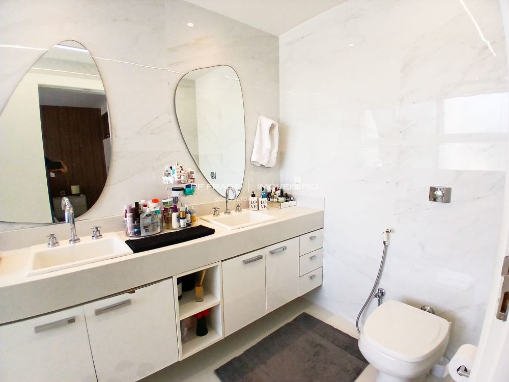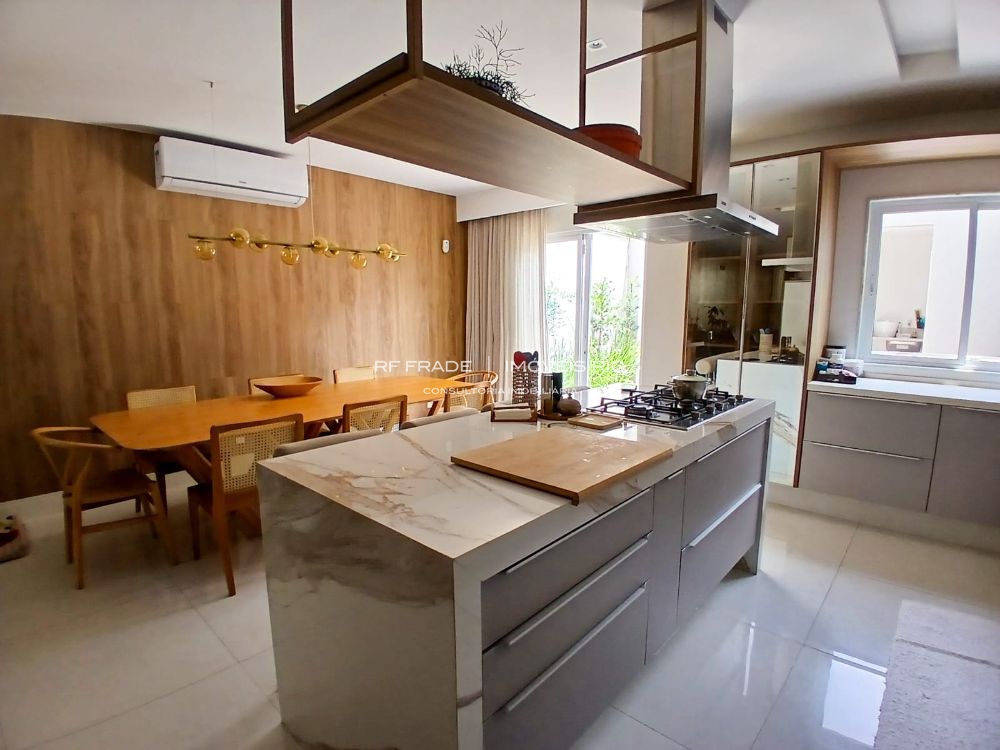 No primeiro pavimento, uma sala ampla, lavabo decorado, cozinha em conceito aberto, com ilha central, integrada à lavanderia e à dependência completa dos funcionários.