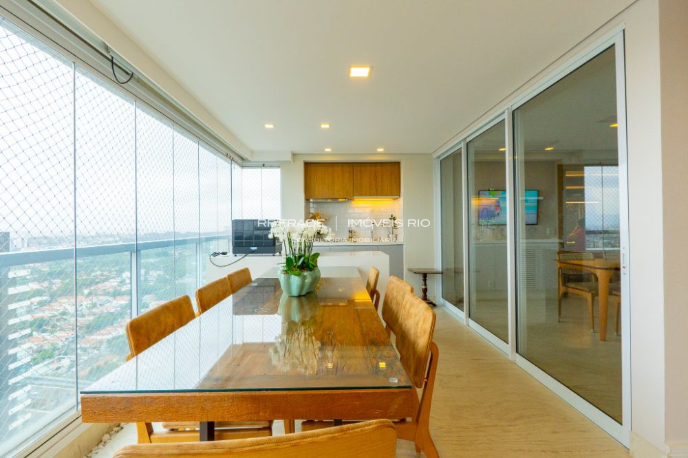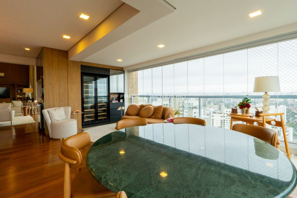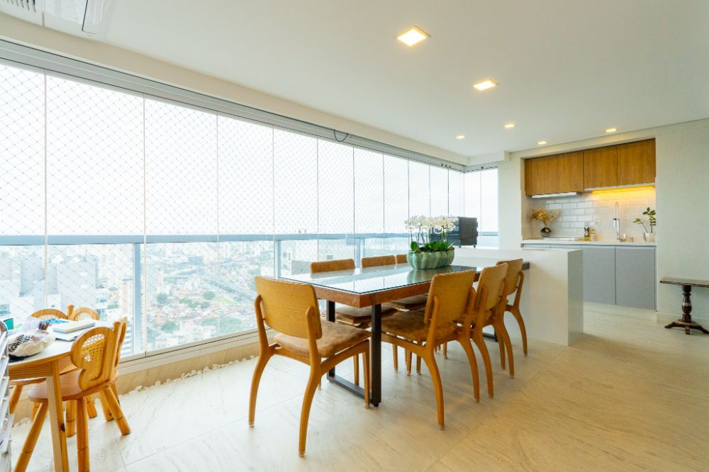 O projeto valoriza a amplitude e a fluidez entre os espaços. O living imponente se abre para um terraço espetacular, criando uma integração natural com a área externa e reforçando a sensação de estar em uma casa — porém nas alturas. A varanda gourmet foi pensada para receber com elegância e conforto, equipada com forno de pizza e cooktop, tornando o ambiente perfeito para encontros memoráveis.